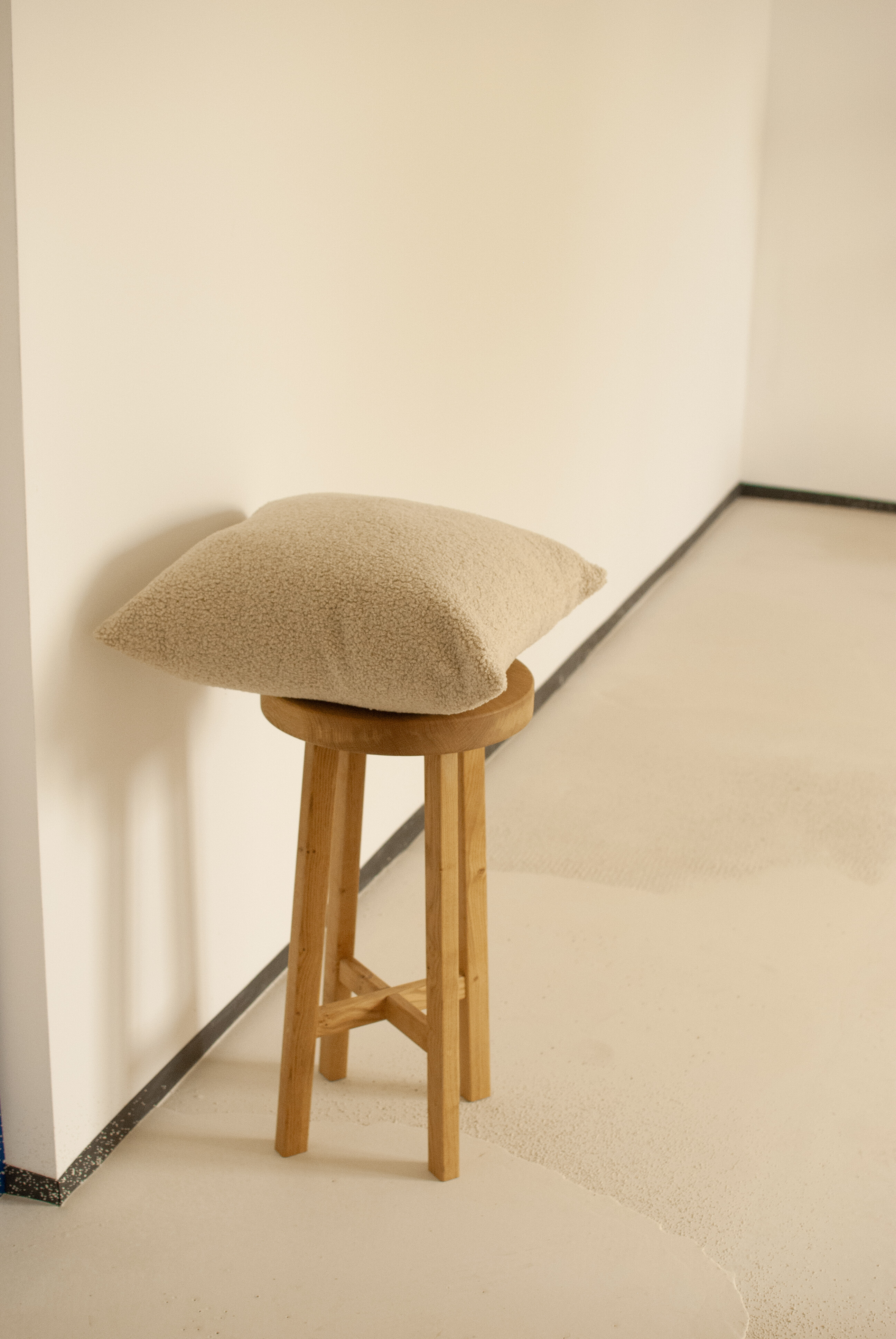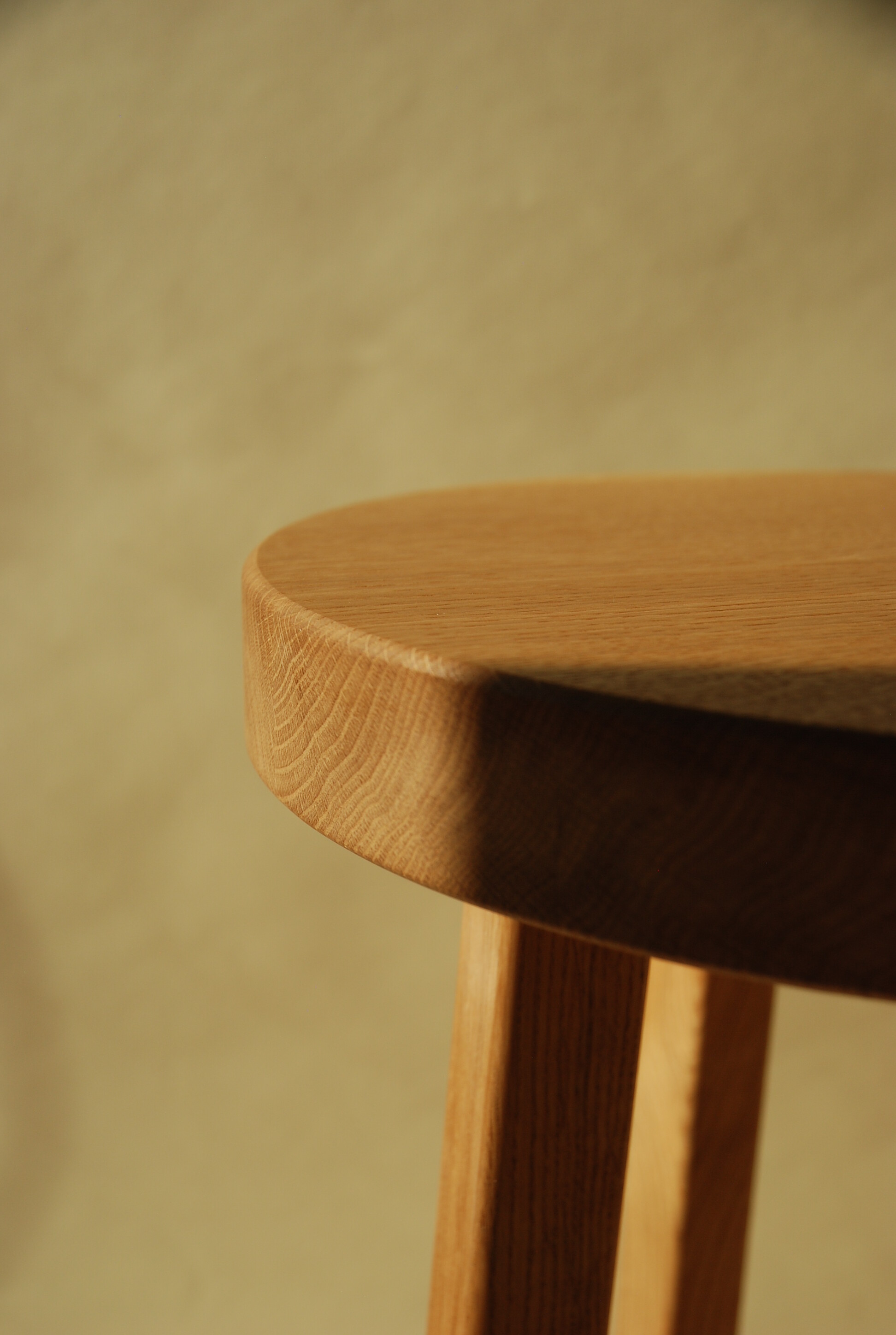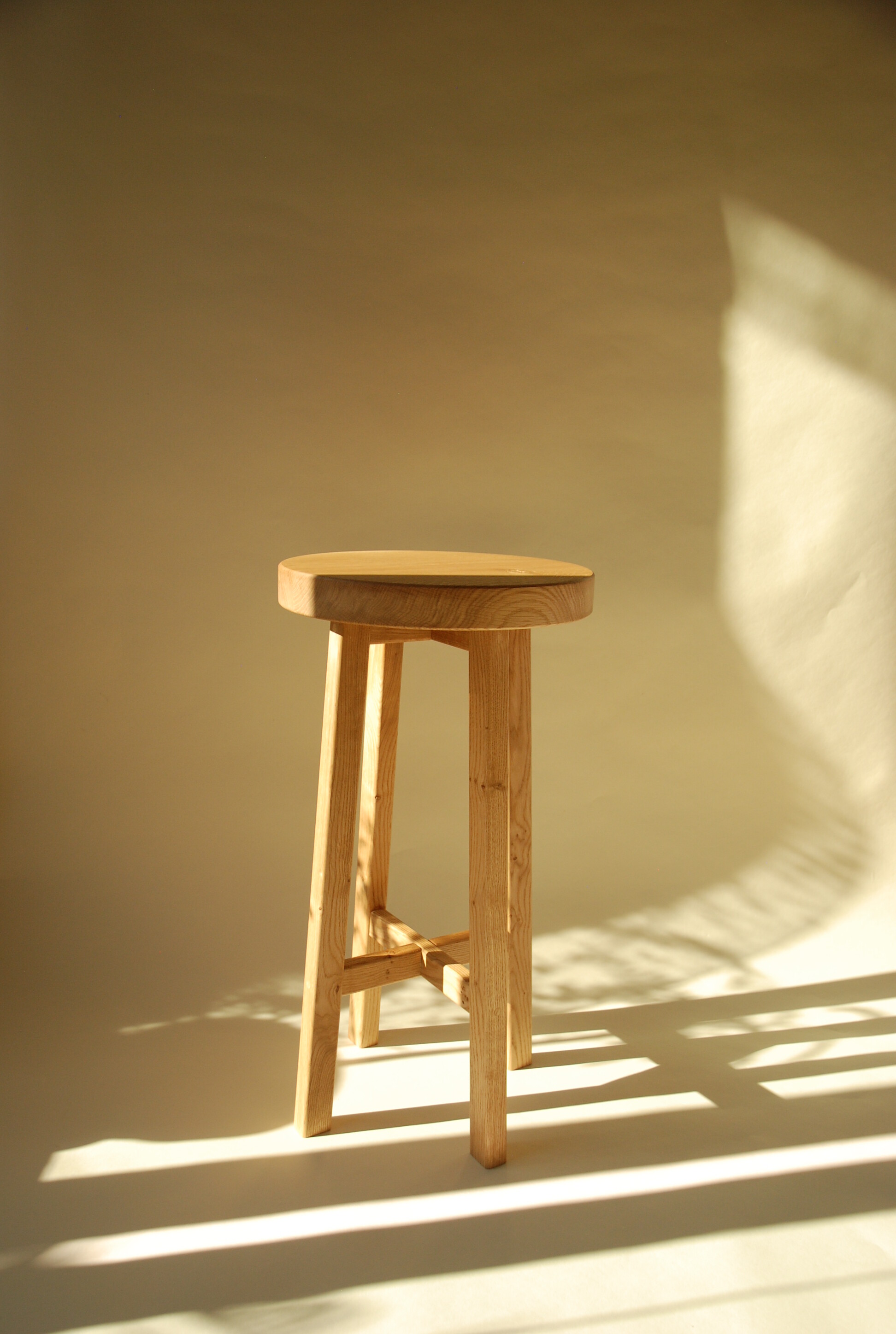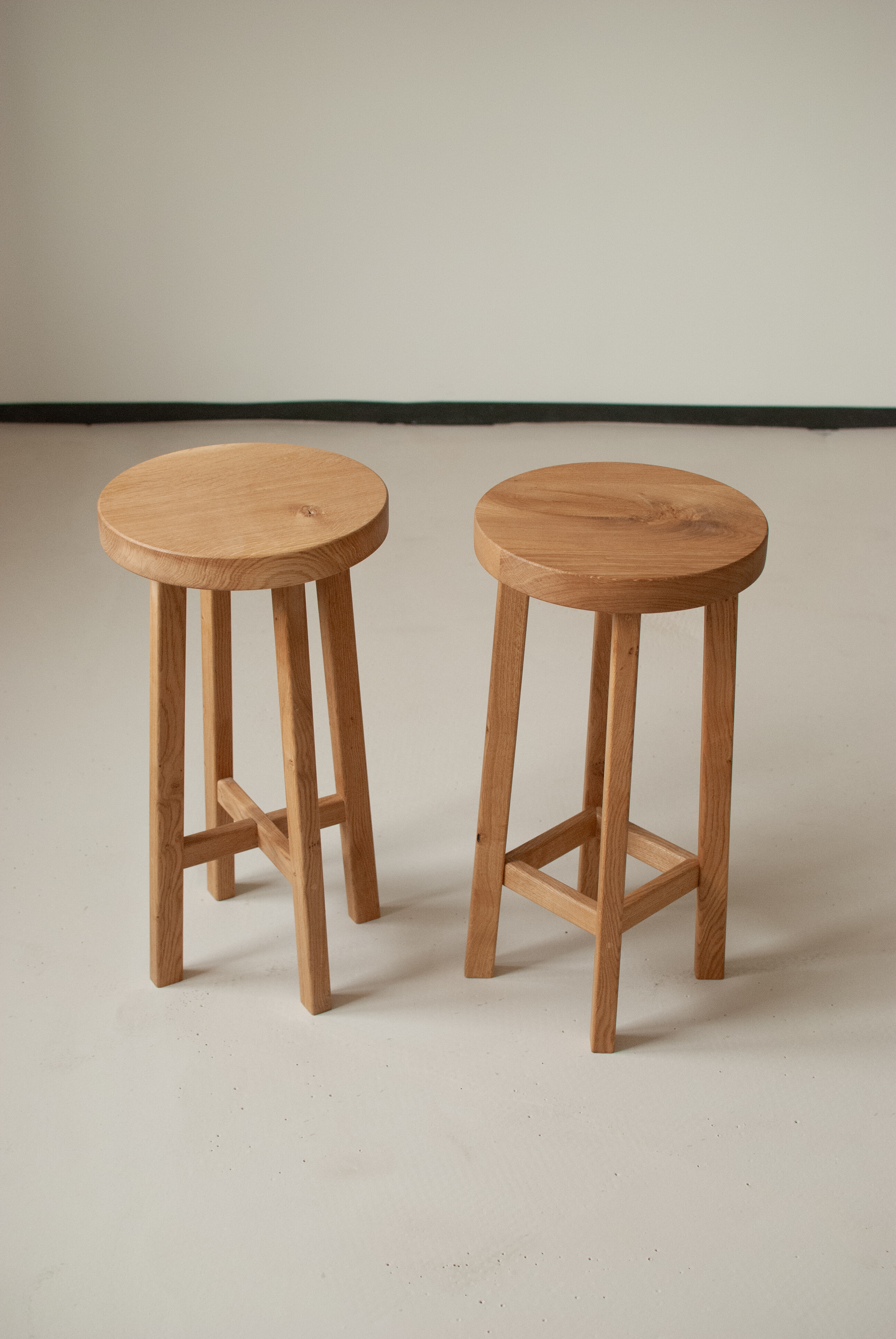 Dębowy stołek Tadeusz, z krzyżowym wspornikiem nóg.