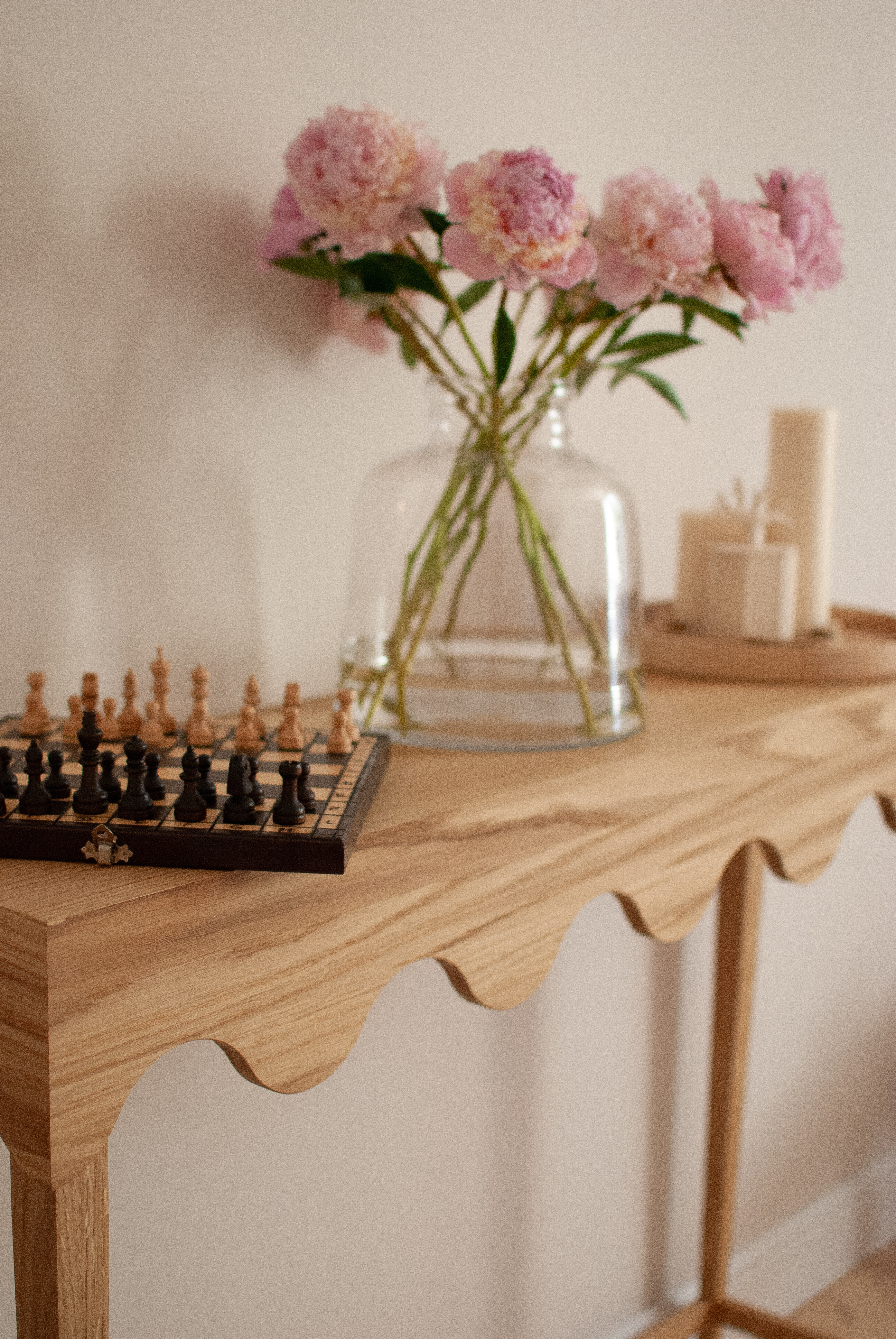 Wyjątkowy scallop design – falisty front, inspirowany miękkimi liniami natury – sprawia, że konsola nie jest tylko praktycznym meblem, ale także dekoracją samą w sobie. Każdy egzemplarz powstaje ręcznie z litego drewna, dzięki czemu zachowuje niepowtarzalny charakter – różnice w usłojeniu, odcieniach i fakturze czynią go unikatem, którego nie znajdziesz w masowej produkcji.