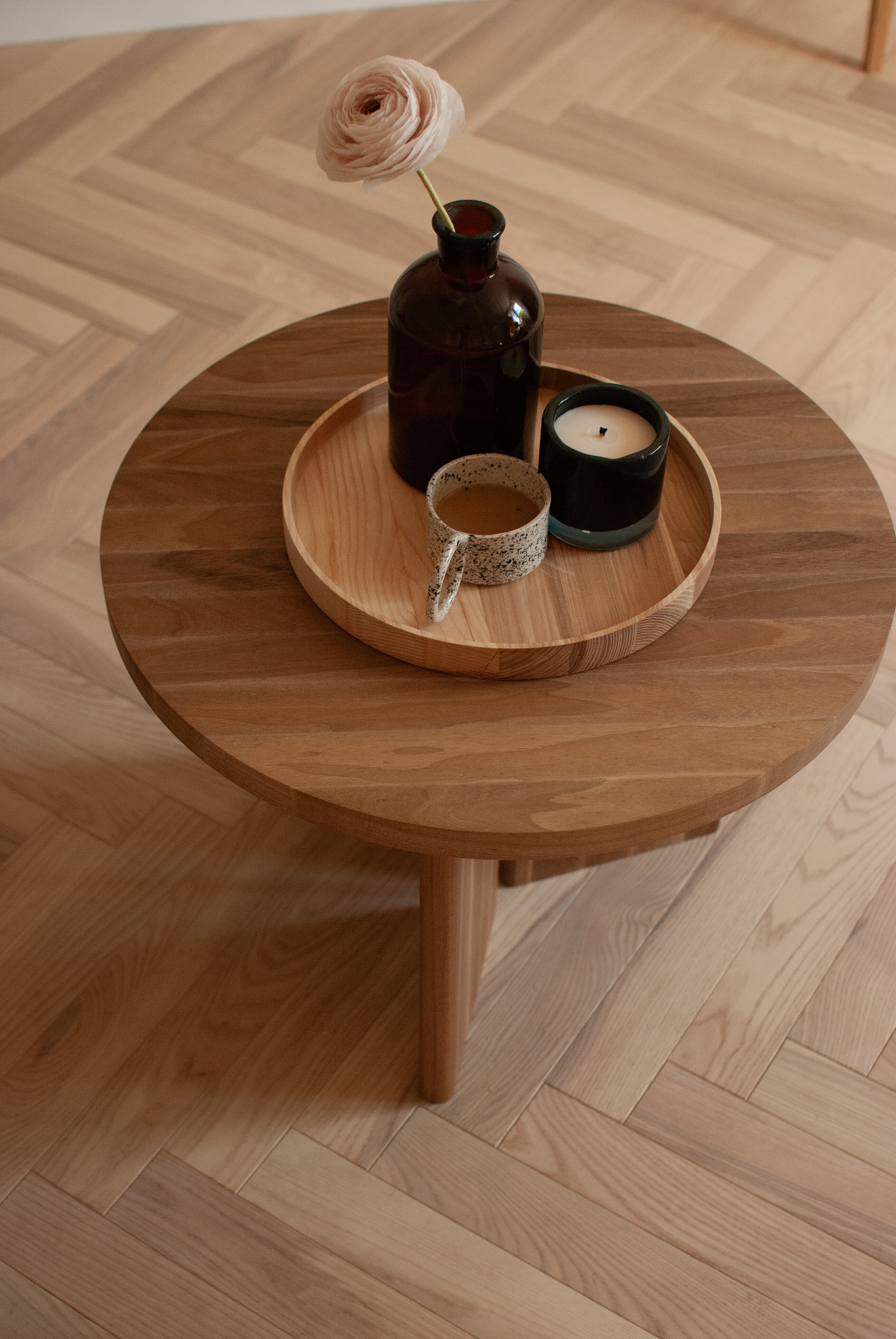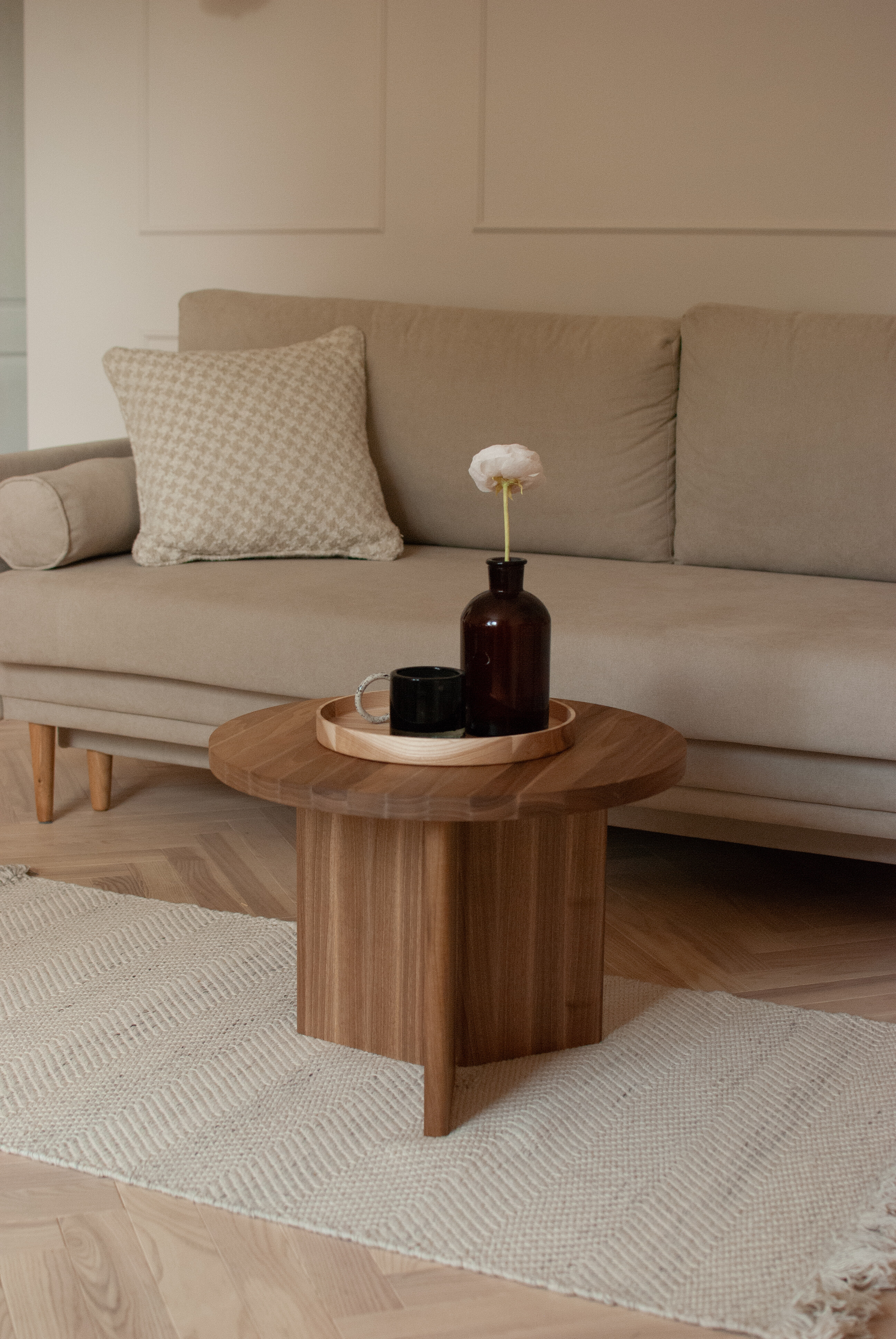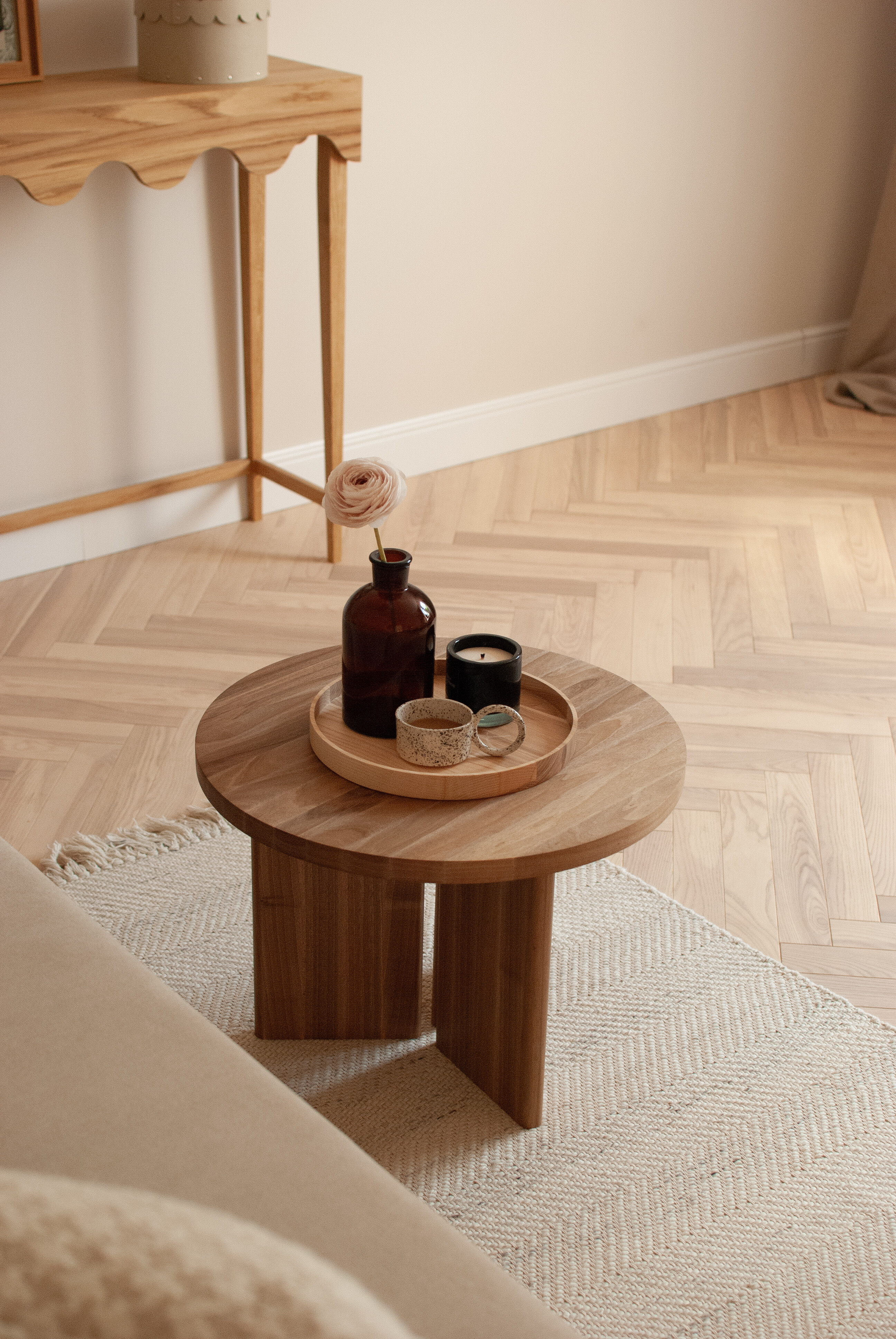 Okrągły stolik kawowy wykonany z litego drewna, wsparty na 3 nogach. Nowoczesna konstrukcja, stolik utrzymany w stylu japandi.
