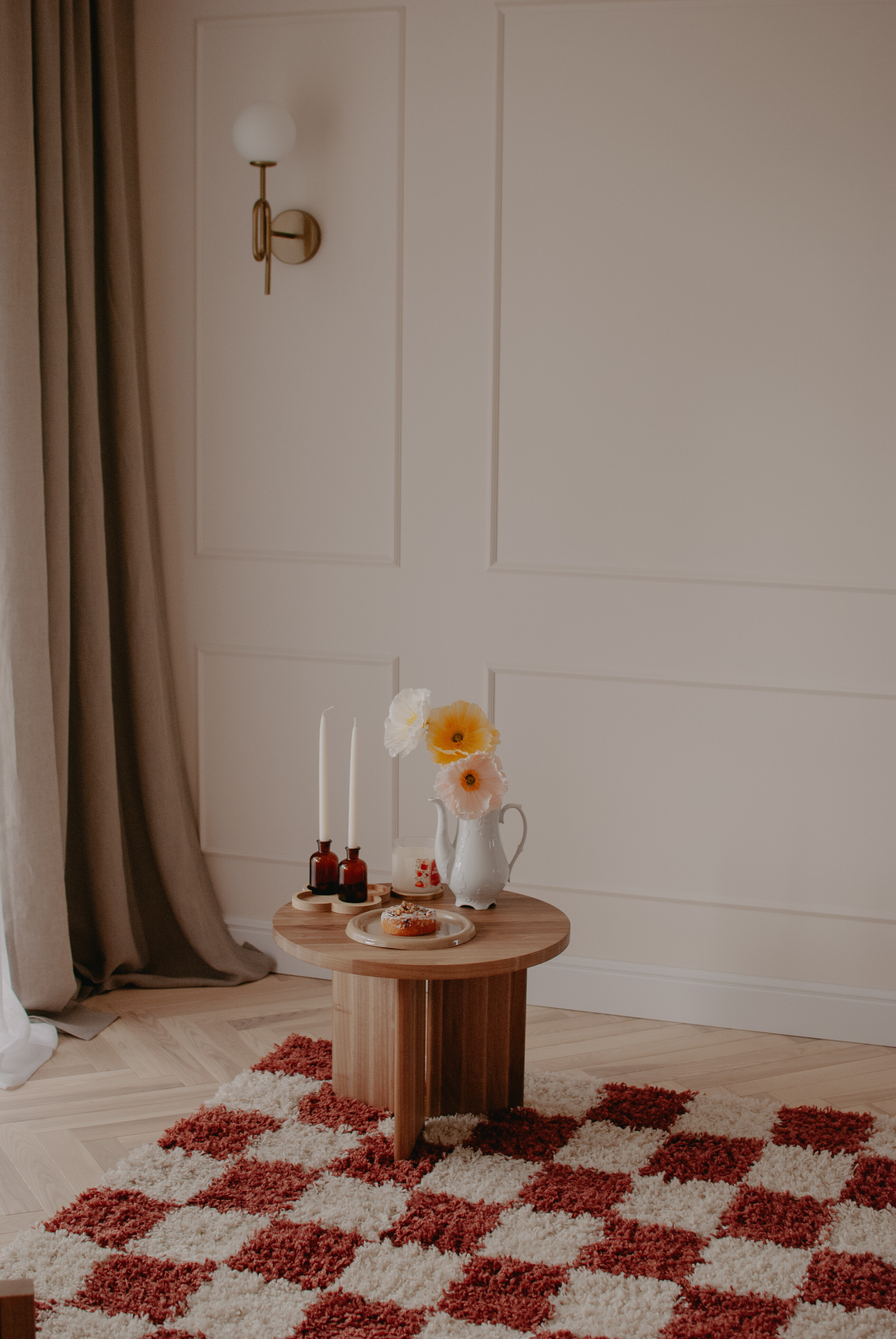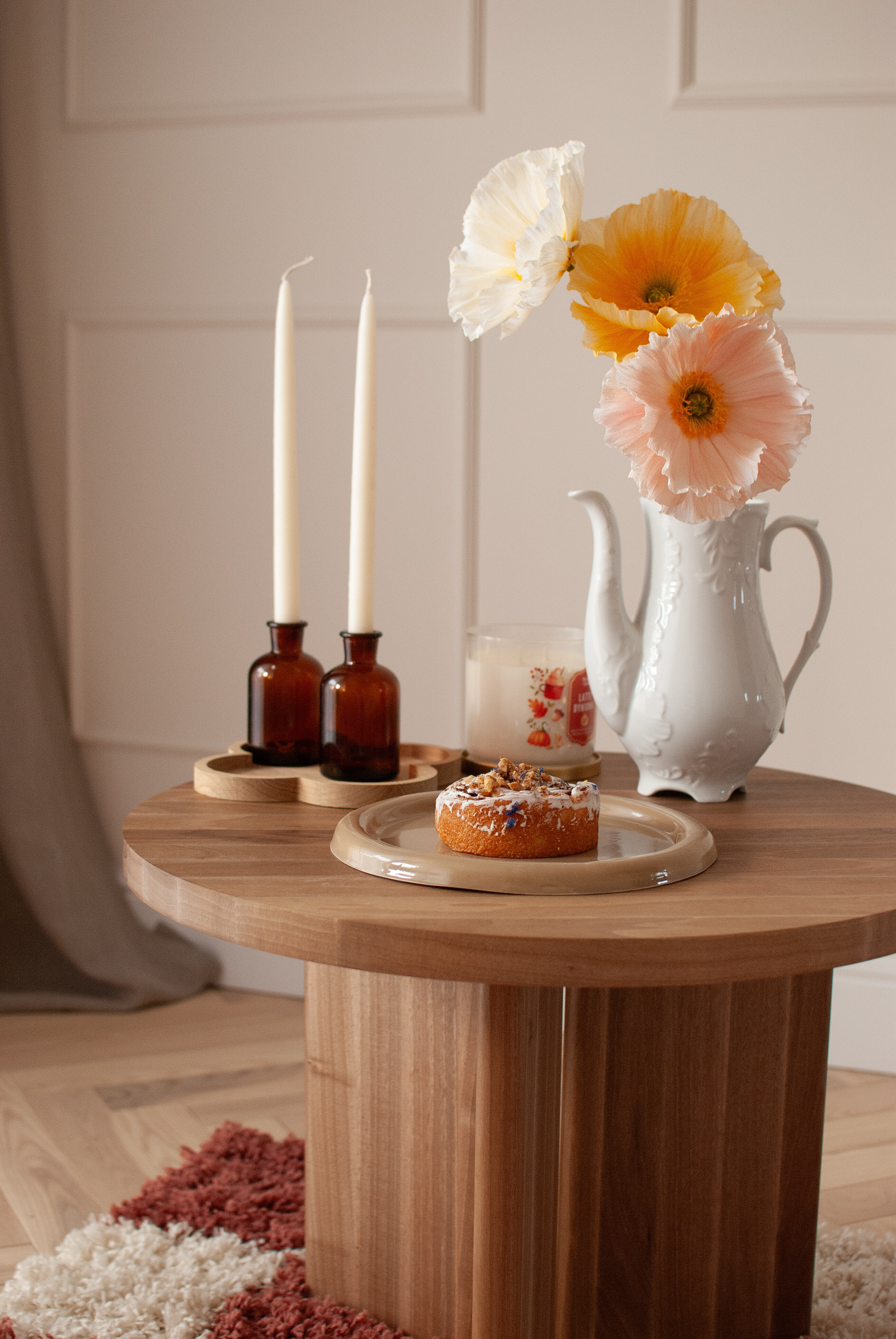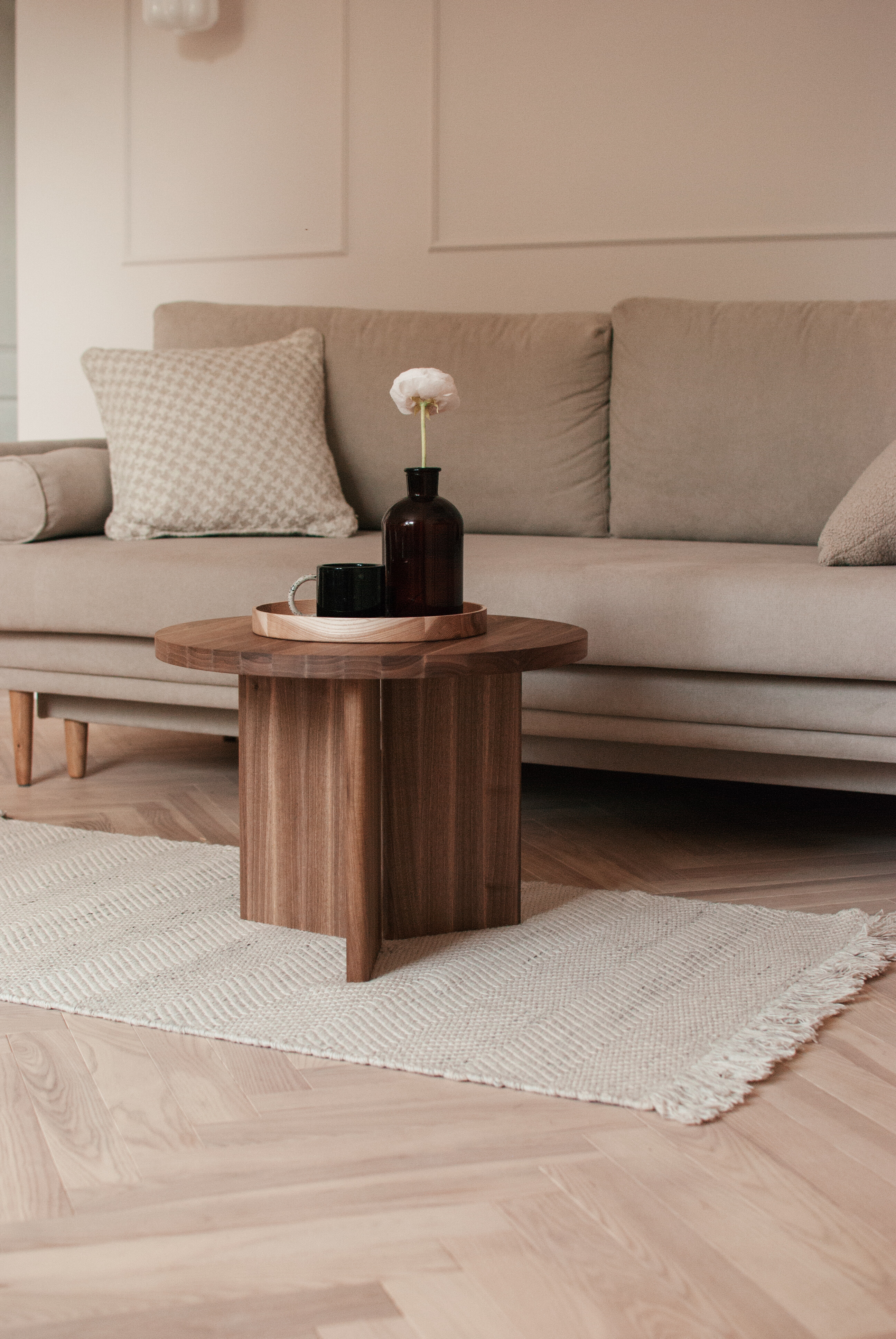 Okrągły stolik kawowy wykonany z litego drewna, wsparty na 3 nogach. Nowoczesna konstrukcja, stolik utrzymany w stylu japandi.